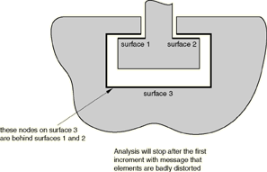 다음 그림은 두 부분의 단순 접합의 2차원 모델을 보여준다. 이 그림에 표시된 접촉 정의는 표면에 의한 이런 물체 형상의 표현이 완전하지 않기 때문에 이 접합을 만들려면 충분하지 않다. 해석이 시작되면 서피스 3의 일부 절점은 서피스 1과 2의 ‘뒷면’에 있다.