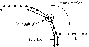 강체의 곡면 형상은 적당히 미세하게 이산화되어야 한다. 다음 그림과 같이 강체의 이산화가 너무 거칠면 접촉하는 변형의 절점이 ‘걸리기(snag)’되어 잘못된 결과를 초래할 수 있다.