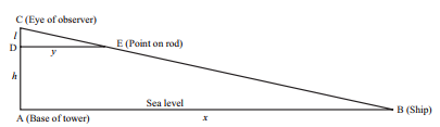 $x$가 배의 미지의 거리라면 유사한 삼각형의 속성에 따라 다음과 같은 관계를 가진다.