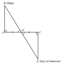 탈레스가 기하학을 실용적으로 응용한 또 다른 예는 바다에 떠 있는 배가 해안에서 얼마나 멀리 떨어져 있는지 알아낸 것이다. 그가 이 목적을 위해 기하학 지식을 어떻게 사용했는지는 있을 뿐이다. 프로클루스에 따르면 탈레스는 한 변과 인접한 두 각을 알면 삼각형이 완전히 결정된다고 주장하는 합동 정리를 사용했다고 한다. 가장 가능성이 높은 가정은 탈레스가 망루 꼭대기에서 배를 관찰하면서 높이 $h$를 기준으로 두 개의 비슷한 직각 삼각형의 변의 비례를 사용했다는 것이다. 탈레스에게 필요한 것은 직각을 이루는 두 개의 다리가 있는 간단한 도구로, 배와의 시선이 지면과 평행하게 다리를 자르는 지점 E를 표시할 수 있었다. 이렇게 하면 비슷한 삼각형 ACB와 DCE가 만들어진다.