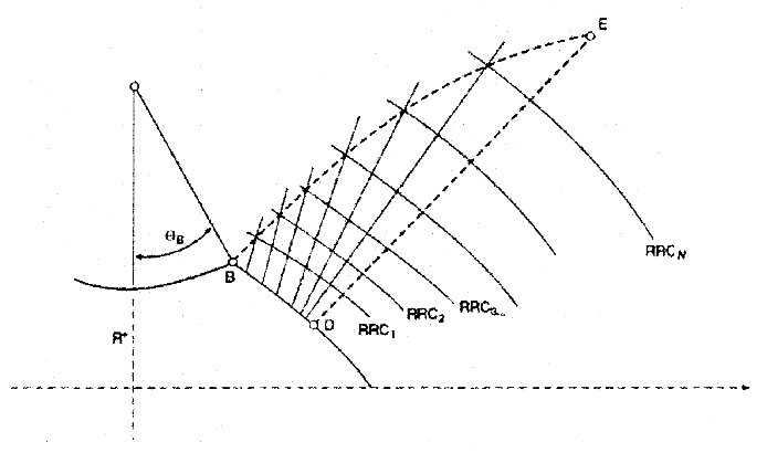 이 커널이 발견되면 두 번째 반복을 시작하여 커널 BF의 마지막 RRC 상에 있는 점 D를 결정합니다. 주어진 점 D에 대해 BD를 통과하는 질량 유량을 구합니다. 그런 다음 D에서 미지의 점 E까지 LRC를 구성하는데, 이때 BD를 통과하는 알려진 질량 유량은 DE를 통과하는 계산된 질량 유량과 같습니다. 이상적인 노즐의 경우 DE를 따라 물성이 균일하므로 점 E를 비교적 쉽게 찾을 수 있습니다. 다른 유형의 노즐의 경우, 적합성 방정식에 정의된 dM/dr 및 dθ/dr과 다음과 같이 정의된 dx/dr을 적분하는 Runge Kutta Fehlberg 방법을 사용하여 E의 위치와 DE를 따라 특성을 구합니다.