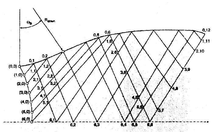 점 (1,1)은 RRC와 점 (2,0)에서 새로 계산된 LRC의 교점입니다. 위의 방정식은 축대칭 노즐 유형을 기반으로 합니다. 평면 노즐에 대해 풀면 방정식이 단순화되지만 과정은 동일합니다. 이 과정은 점 B까지 모든 특성 교점에 대해 계속됩니다. 점 B의 위치는 θ_B로 정의된 초기 팽창 영역의 마지막 점으로 정의됩니다. 2D 솔루션이므로 노즐 중심선이 대칭축 역할을 합니다. 결과적인 특성 메쉬(TBFT') 는 다음 그림 5과 같습니다. 점 F는 B에서 시작하는 RRC를 따라 있는 중심선상의 점입니다.