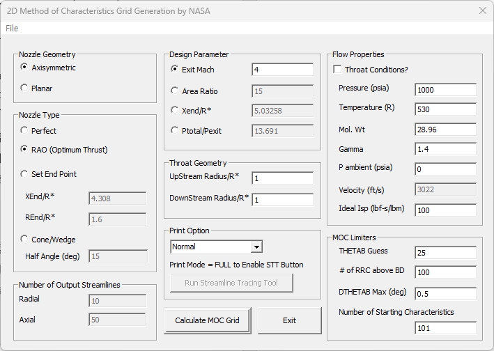본 연구에서 개발된 2D MOC 도구는 GUI 기반의 Windows 소프트웨어로, 다양한 사용자 입력을 바탕으로 평면 및 축대칭 노즐 설계를 생성할 수 있습니다. 생성된 노즐 설계는 이상 기체, 비점성 노즐 해석 알고리즘을 기반으로 합니다. 그림은 메인 GUI 창을 보여줍니다. 이 메인 창에는 8가지 유형의 입력이 있습니다. 다음에서는 이러한 입력과 구현 방법을 설명합니다.