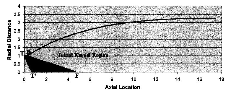 MOC 솔루션은 초기 데이터 라인(그림 3의 TT')을 생성하는 것으로 시작합니다. 이 라인을 따라 형상과 유동 특성을 결정하는 데 사용할 수 있는 여러 가지 방법이 있으며, 이건 나중에 논의됩니다. 현재로서는 이 라인에 대해 알아야 할 중요한 사항은 다음과 같습니다. (1) 라인을 따라 모든 지점에서 유동 특성을 알 수 있습니다. (2) 모든 지점에서 유동은 초음속입니다. 그림 4는 초기 데이터 라인과 노즐의 초기 팽창 영역의 예를 보여줍니다.