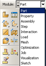 앞서 언급했듯이 Abaqus/CAE는 모듈(Module)이라는 기능으로 나눈다. 각 모듈은 모델을 만들 때 특정 부분과 관련된 도구만 포함되어 있다. 예를 들어 Mesh 모듈은 요소망을 만드는 데 필요한 도구만 있고, Job 모듈은 해석 작업을 생성, 편집, 제출, 관찰하는 데 필요한 도구만 있다. 모듈은 그림과 같이 모듈 목록에서 선택한다.