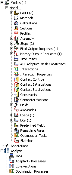 모델 트리에서 컨테이너와 항목의 순서는 모델을 만드는 순서를 반영한다. 앞에서 말했듯이 모듈 메뉴의 순서도 같은 규칙을 따른다. 다시 말하면, Assembly 앞에 Parts를 만들고, Loads 앞에 Steps를 만든다. 이 순서는 고정되어 모델 트리의 항목을 이동할 수 없다.