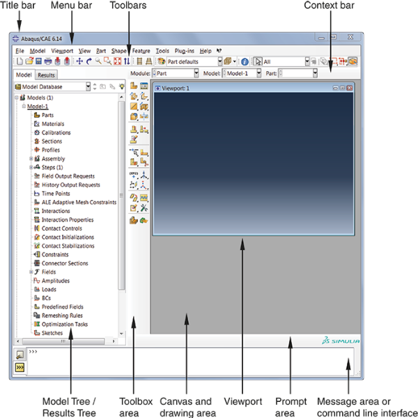 제목(Title)에는 현재 실행 중인 Abaqus/CAE 버전과 현재 모델 데이터베이스의 이름이 표시된다. 메뉴(Menu) 모음은 사용할 수 있는 모든 메뉴를 나타내며, 모든 기능에 접근할 수 있다. 컨텍스트 바(Context bar)는 사용할 모듈을 선택할 수 있고, 선택 모듈에 따라 다른 메뉴가 나타난다. 툴바(Toolbar)는 메뉴 항목의 빠른 접근 기능을 제공한다.