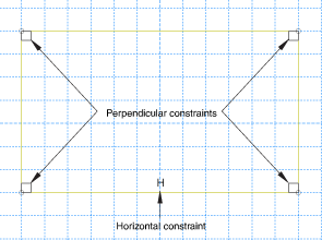 8. Sketcher는 그림과 같이 스케치에 여러 구속조건을 자동으로 추가한다. 계속 진행하기 전에 수직 구속조건은 제거해야 한다. Sketcher 도구 상자에서 Delete 도구를 선택하고, 프롬프트에서 작업 범위로 Constraints를 선택한다. [Shift]+Click을 사용하여 네 개의 수직 구속조건을 선택한다. 프롬프트에서 Done을 클릭한다.