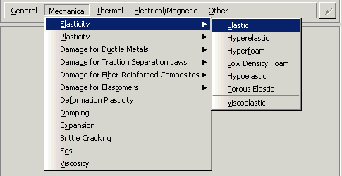 3. Edit Materials 대화 상자는 모든 사용할 수 있는 재료를 포함하는 메뉴를 표시한다. 메뉴는 하위 메뉴를 가질 수도 있다. 예를 들어 그림은 Mechanical → Elasticity 메뉴에서 사용할 수 있는 재료 모델을 보여준다. 재료 모델을 선택하면 해당 데이터 입력 양식이 메뉴 아래에 표시된다.