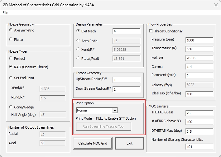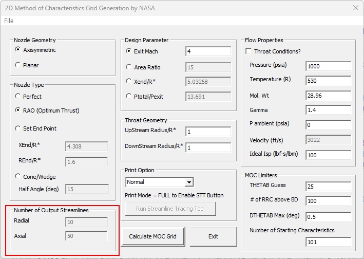 이 입력값들은 초기 MOC 그리드와 코드 효율성에 영향을 미칩니다. Theta_B Guess 입력값은 Theta_B 반복 계산의 시작점을 제공합니다. 일반적으로 노즐 길이가 길수록(즉, 완벽한 노즐일수록) 짧은 노즐(Rao)보다 Theta_B 값이 낮습니다. 기본 값인 25˚가 제공되며 대부분의 경우에 적용됩니다.