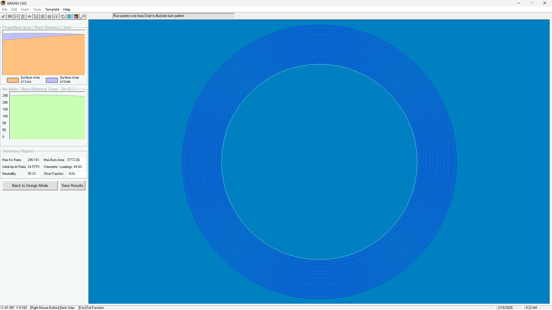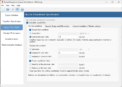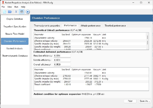 이 목록 다음에는 성능 매개변수 요약이 나옵니다. 이 매개변수는 두 부분으로 나뉩니다. 첫 번째 부분은 2D 성능(질량 유량, 추력 등)을 나타내고, 두 번째 부분은 1D 성능을 나타냅니다. 2D 계산의 경우 성능은 개별 유동점의 적분을 통해 얻어지며, 1D 계산은 노즐 전체 조건에서 균일한 마하 1인 노즐목까지 1D 등엔트로피 과정을 기반으로 합니다.