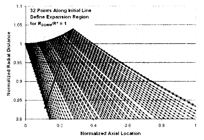그림에서 볼 수 있듯이, 초기 데이터 라인을 따라 32개 점(초기 101개 점 중)을 사용하여 초기 노즐 팽창 영역을 결정합니다. 이건 MOC 격자에 계산의 안정적인 시작점을 제공하는 것으로 보입니다. 일반적으로 점이 많을수록 좋지만, 점이 너무 많으면 RRC가 너무 가깝게 위치하거나 교차하여 솔루션에 어려움을 초래할 수 있습니다. 따라서 주어진 설계에 대해 더 좋거나 나쁜 점의 개수는 정해져 있지 않습니다.