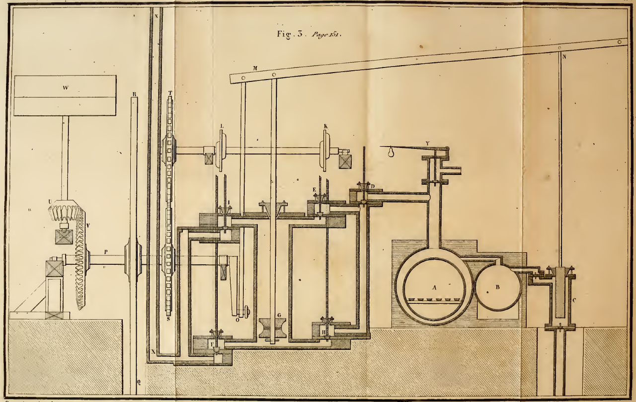 1807년 올리버 에반스는 〈Mars〉 제철소를 설립했다. 1812년에는 24시간 동안 12톤의 석고를 갈아내고 12시간 동안 12피트의 속도로 대리석을 절단하는 등 '완벽한 성공'을 거두었다고 보고했다. 필라델피아에 두 대, 미시시피에 세 대의 엔진이 있었고, 그중 두 대는 제재소를 가동했으며, 피츠버그에 서너 대는 곡물을 제분하고 철을 압연했고, 오하이오주 마리에타에 한 대, 켄터키주 렉싱턴에 또 다른 엔진이 있었고, 코네티컷주 미들타운에 있는 또 다른 엔진은 천 공장을 운영하고 있었으므로 그는 이 엔진이 '추측성 이론'이 아니었다고 말했다.