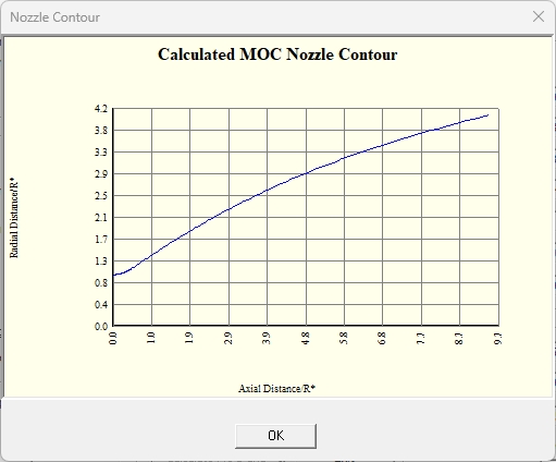 이 버튼을 누르면, 각 입력란에 표시된 값을 사용하여 계산 사이클이 시작됩니다. 사이클이 완료되면 노즐 윤곽 그래프가 새 창에 나타납니다. 이 창을 닫아야 도구에서 필요한 파일을 출력할 수 있습니다.