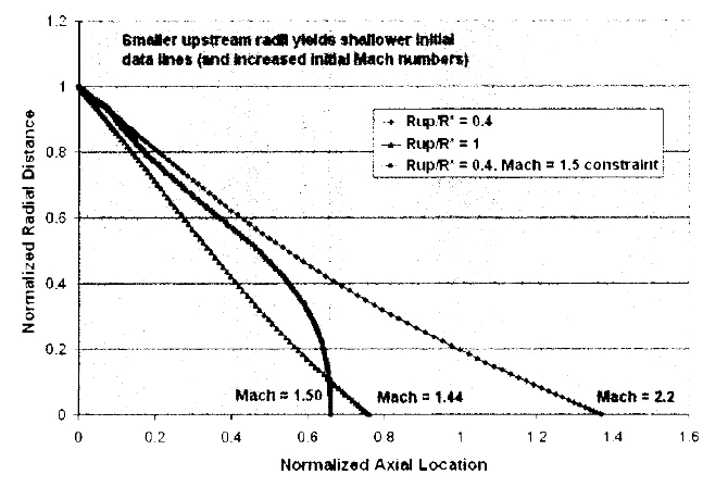 상류 반경 매개변수는 초기 데이터 라인에 상당한 영향을 미칩니다. 상류 반경이 증가함에 따라 계산된 유속은 거의 1/(Rup+1)만큼 증가합니다. 다음 그림은 두 개의 상류 반경에 대한 초기 데이터 라인을 보여줍니다. 마하 1.5 제약 조건 없이 반경을 고려했을 때, 상류 반경이 감소함에 따라 계산된 마하 수는 증가합니다. 이로 인해 계산된 유동 각도가 얕아지므로 구성된 RRC가 하류로 이동합니다. 경우에 따라 이는 노즐 해석에 어려움을 초래할 수 있습니다. 다음 그림의 세 번째 줄은 마하 1.5 제약 조건을 적용한 해석 결과를 보여주며, 안정적인 데이터 선을 나타냅니다. 마하 제약 조건과 선의 형상은 임의로 설정되었습니다. 이 도구는 다양한 노즐 설계에서 이 방법이 효과적인 것으로 입증되었기 때문에 이 방법을 사용합니다.