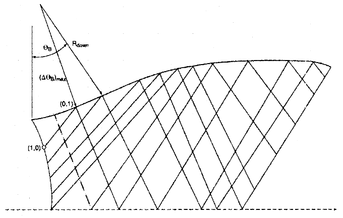 DTHETAB Max 입력값은 초기 노즐 팽창 아크(TB)를 따라 RRC 밀도를 설정하는 데 도움이 되는 매개변수입니다. 주어진 시작 특성 개수에 따라 MOC 솔루션이 시작됩니다. LRC가 노즐 벽에 도달하면 중심선 방향으로 반사됩니다. DTHETAB는 노즐 벽의 두 지점 사이의 Theta_B의 최대 차이를 나타냅니다. 차이가 입력값 DTHETAB보다 크면 해당 지점에 새로운 RRC가 생성됩니다. 그림 18에 예시가 나와 있습니다. 초기 벽 지점과 점 (0,1) 사이의 각도가 정의된 (DTHETAB)MAX보다 큽니다. 초기 벽 지점에서 (DTHETAB)MAX 각도만큼 떨어진 위치에 새로운 RRC(빨간색 점선으로 표시)가 생성됩니다. 이 과정을 통해 노즐 전체에 걸쳐 유동을 더 정확하게 정의할 수 있습니다. DTHETAB 값이 작을수록 실행 시간은 증가하지만 격자가 더 정밀해집니다. 일반적인 값은 0.25˚에서 0.5˚ 사이입니다.